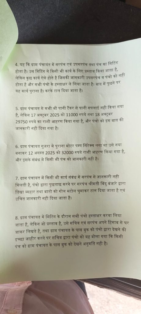 - सचिव के साथ मिलीभगत और बदसलूकी: पंचों को बैठकों में कोरे पन्नों पर हस्ताक्षर कराए गए और प्रस्ताव बाद में तैयार किए गए।