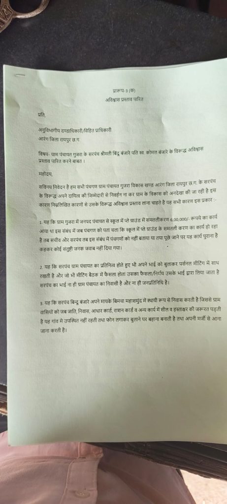 आरंग। रायपुर जिले के आरंग विकासखंड अंतर्गत ग्राम पंचायत गुजरा में पंचायत की राजनीति गरमाने लगी है। सरपंच बिंदू बंजारे के कार्यप्रणाली से नाराज उपसरपंच और पंचों ने एकजुट होकर अविश्वास प्रस्ताव लाने की मांग की है और इसके लिए ज्ञापन अनुविभागीय अधिकारी (SDM) अभिलाषा पैकरा को सौंपा है।