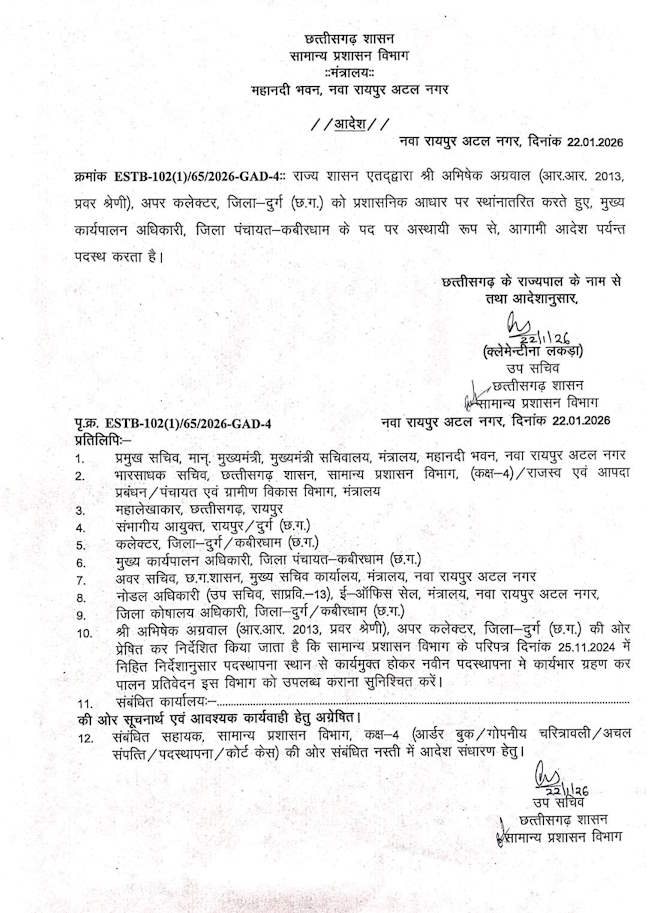 प्रशासनिक फेरबदल: दुर्ग के अपर कलेक्टर अभिषेक अग्रवाल बने कबीरधाम जिला पंचायत के नए CEO