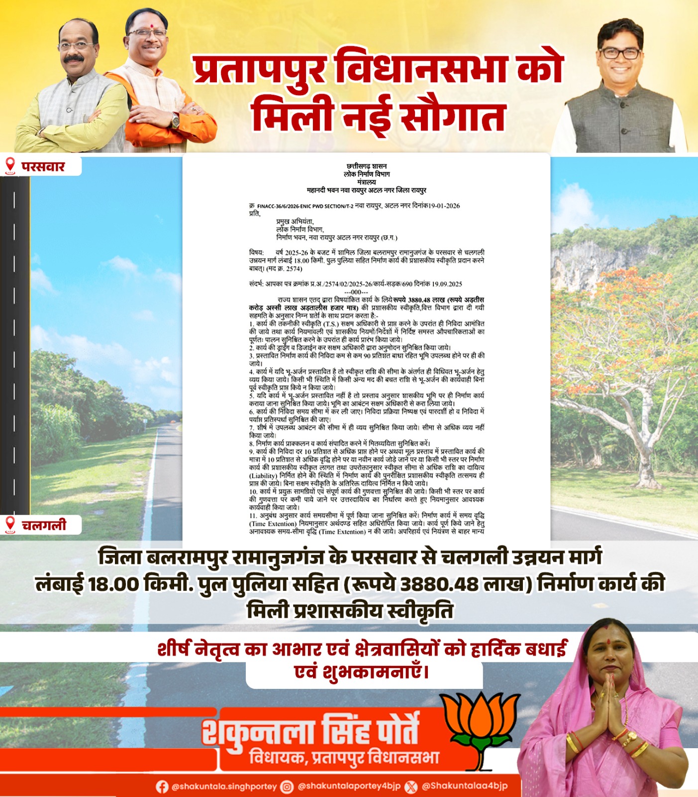 प्रतापपुर विधानसभा को मिली बड़ी सौगात, परसवार–चलगली उदयन मार्ग निर्माण को मिली मंजूरी
