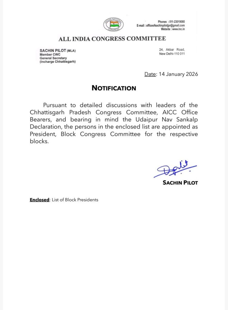 छत्तीसगढ़ कांग्रेस में बड़ा संगठनात्मक फैसला, 307 ब्लॉक अध्यक्ष नियुक्त