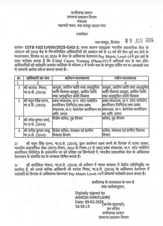 छत्तीसगढ़ सरकार ने चार आईएएस अधिकारियों की पदोन्नति सूची जारी कर दी है। वर्ष 2010 बैच के इन अधिकारियों को 16 वर्ष की सेवा पूर्ण करने के बाद उच्च वेतनमान में पदोन्नत किया गया है।