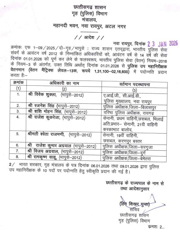छत्तीसगढ़ शासन के गृह (पुलिस) विभाग ने भारतीय पुलिस सेवा (IPS) के अधिकारियों की पदोन्नति को लेकर महत्वपूर्ण आदेश जारी किया है। विभिन्न बैच के अधिकारियों को अतिरिक्त पुलिस महानिदेशक (ADG), पुलिस महानिरीक्षक (IG), उप पुलिस महानिरीक्षक (DIG) एवं चयन श्रेणी में पदोन्नत किया गया है।