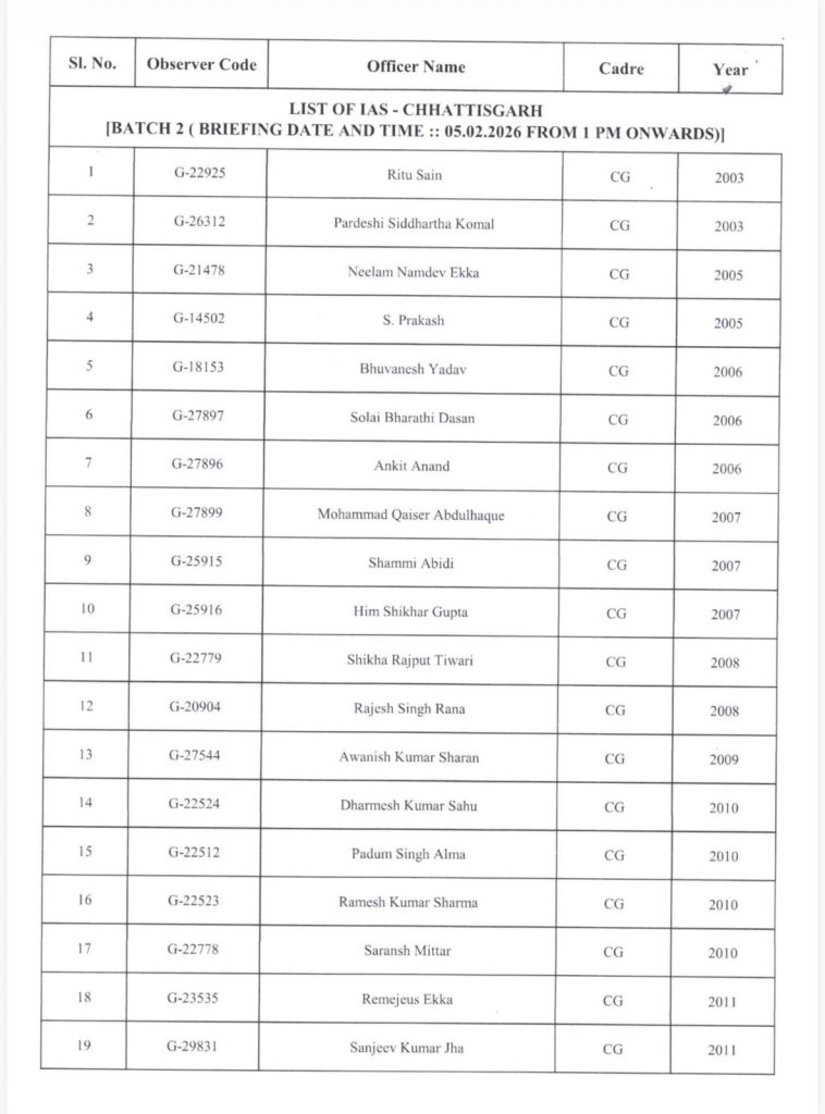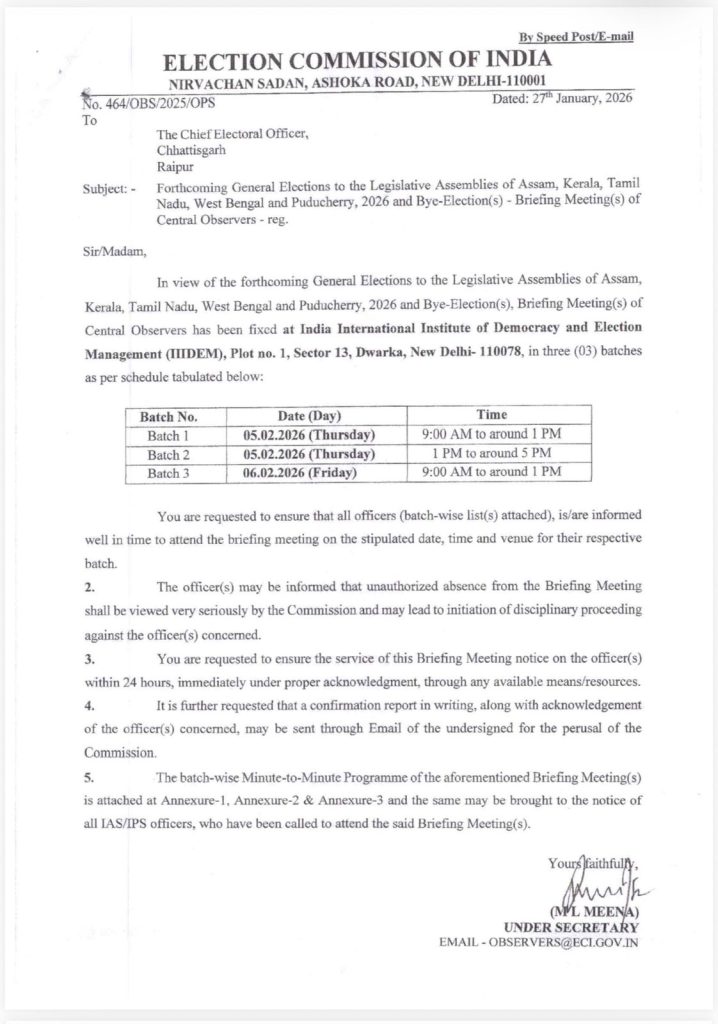 असम, केरल, तमिलनाडु, पश्चिम बंगाल और पुडुचेरी में होने वाले आगामी विधानसभा चुनावों को लेकर छत्तीसगढ़ के वरिष्ठ प्रशासनिक और पुलिस अधिकारियों को बड़ी जिम्मेदारी सौंपी गई है। भारत निर्वाचन आयोग द्वारा छत्तीसगढ़ के 25 IAS और 5 IPS अधिकारियों को चुनाव ऑब्जर्वर नियुक्त किया गया है।