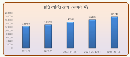 प्रति व्यक्ति आय (प्रचलित भावों पर) वर्ष 2024-25 में 1,62,848 रुपये से बढ़कर वर्ष 2025-26 में 1,79,244 रुपये होने का अनुमान है। यह 10.07% की वृद्धि दर्शाता है।
