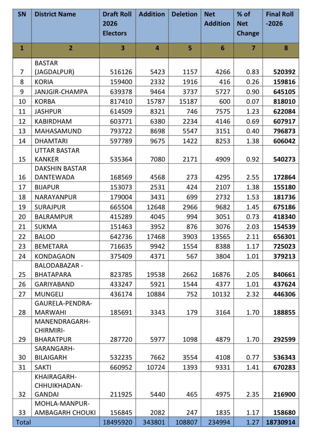 रायपुर। छत्तीसगढ़ में मतदाता सूची के विशेष संक्षिप्त पुनरीक्षण (SIR) की प्रक्रिया पूरी होने के बाद निर्वाचक नामावली का अंतिम प्रकाशन कर दिया गया है। मुख्य निर्वाचन पदाधिकारी यशवंत कुमार ने जानकारी दी कि अभियान के दौरान लगभग 24 लाख 99 हजार से अधिक मतदाताओं के नाम सूची से हटाए गए हैं।