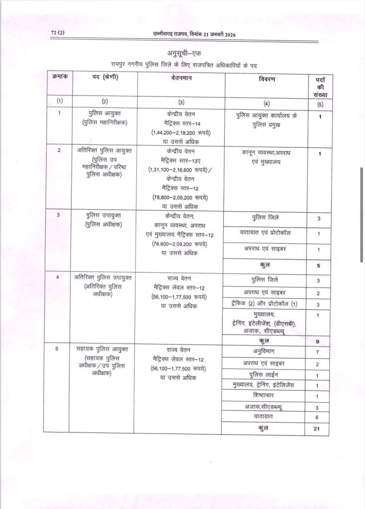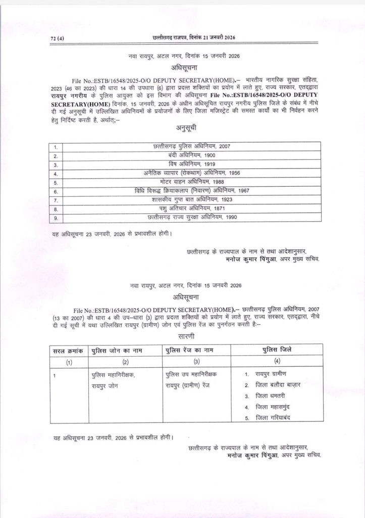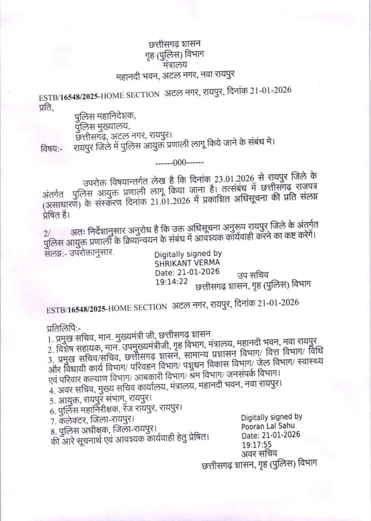 छत्तीसगढ़ शासन ने राजधानी रायपुर में पुलिस कमिश्नरी सिस्टम लागू करने संबंधी अधिसूचना जारी कर दी है। गृह (पुलिस) विभाग द्वारा जारी आदेश के अनुसार रायपुर नगर क्षेत्र को औपचारिक रूप से पुलिस कमिश्नरेट घोषित किया गया है। यह नई व्यवस्था 23 जनवरी 2026 से प्रभावशील होगी।