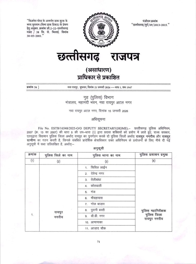 रायपुर नगर पुलिस जिले के तहत आने वाले 21 थाना क्षेत्र अब पुलिस आयुक्त के अधीन होंगे—