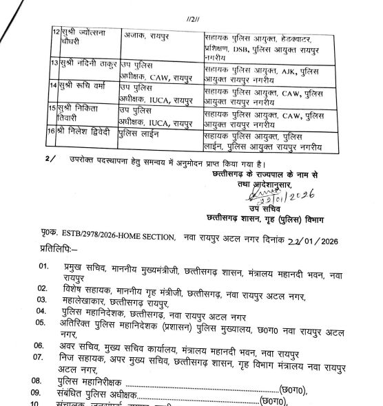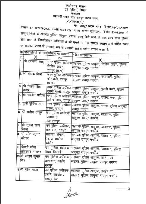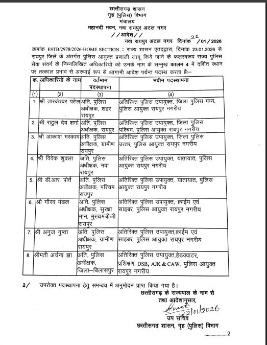 गृह विभाग ने बताया कि ये तैनातियां पुलिस कमिश्नरी प्रणाली के तहत संगठनात्मक ढांचे को सुदृढ़ करने और राजधानी रायपुर में बेहतर कानून व्यवस्था सुनिश्चित करने के लिए की गई हैं।