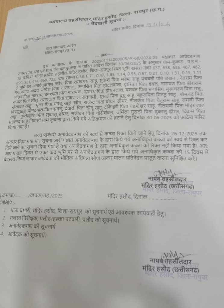 ग्राम कुकरा में लगभग 38 अतिक्रमणकारियों ने शासकीय जमीन पर अवैध निर्माण कर रखा है। एक वर्ष पूर्व ग्राम पंचायत द्वारा इन अतिक्रमणों को हटाने का प्रस्ताव पारित किया गया था, लेकिन राजस्व विभाग और स्थानीय प्रशासन की सुस्ती के कारण अब तक कोई ठोस कदम नहीं उठाया गया।