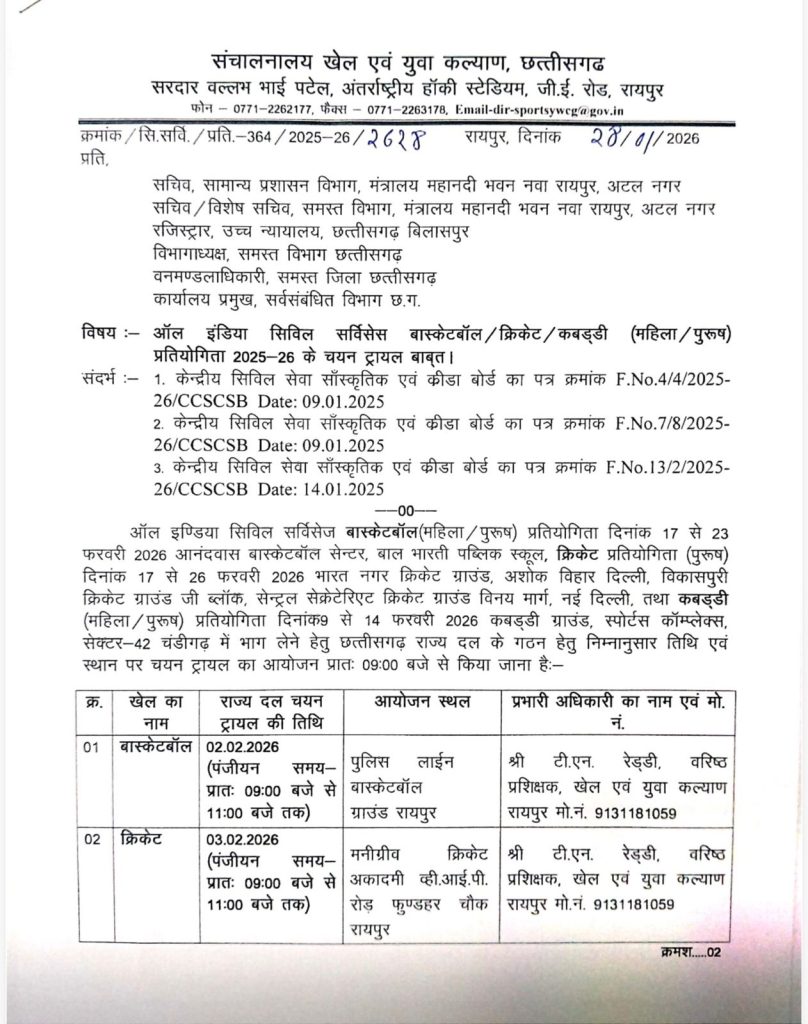 रायपुर: ऑल इंडिया सिविल सर्विसेज प्रतियोगिता में भाग लेने के लिए विभिन्न खेलों के ट्रायल की तिथियां तय कर दी गई हैं। खेल विभाग द्वारा बास्केटबॉल, क्रिकेट और कबड्डी खेलों के लिए ट्रायल आयोजित किए जा रहे हैं। इस संबंध में सामान्य प्रशासन विभाग, सचिव, विशेष सचिव सहित मंत्रालय के सभी विभागों को पत्र भेजकर जानकारी दी गई है।