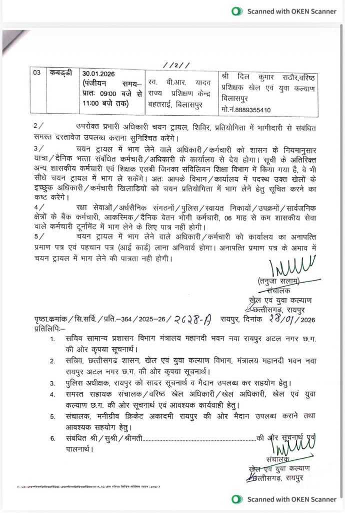 कबड्डी ट्रायल का आयोजन 30 जनवरी 2026 को स्वर्गीय बी.आर. यादव राज्य प्रशिक्षण केंद्र, बहतराई, बिलासपुर में किया जाएगा।