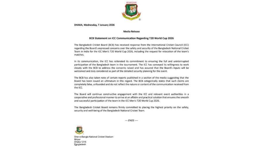 ICC ने यह भी साफ कर दिया है कि यदि बांग्लादेश टीम भारत आने से इनकार करती है, तो उसे टूर्नामेंट के अंक गंवाने पड़ सकते हैं। ICC के इस सख्त रुख के बाद बांग्लादेश क्रिकेट बोर्ड ने आधिकारिक बयान जारी कर बताया कि उन्हें लिखित रूप में सुरक्षा को लेकर आश्वासन मिल चुका है और टीम की हिफाजत को लेकर उनकी चिंताओं का समाधान किया गया है।